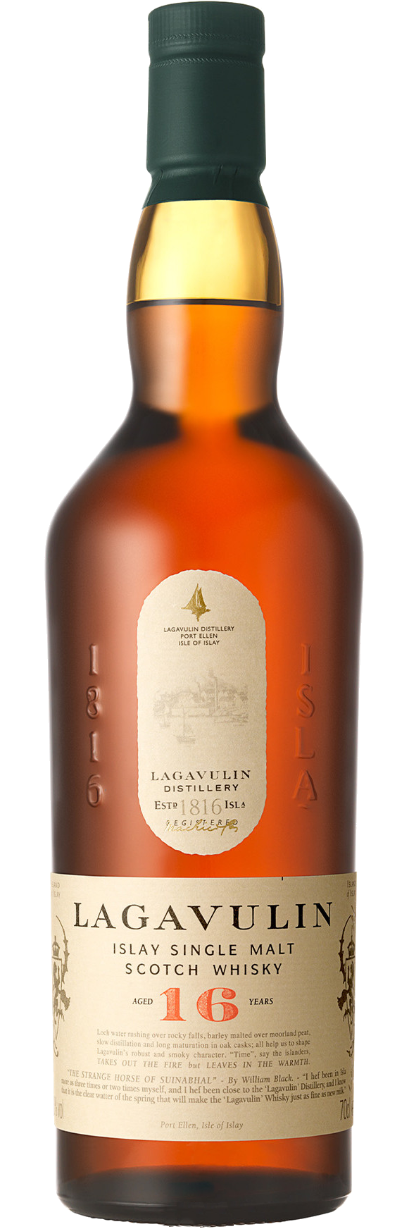 Distillato con alambicchi tradizionali e utilizzando acqua purissima dai Solum Lochs, il Lagavulin 16 Anni beneficia di un invecchiamento lento e meticoloso in botti di quercia, che gli conferiscono il suo profilo aromatico distintivo.